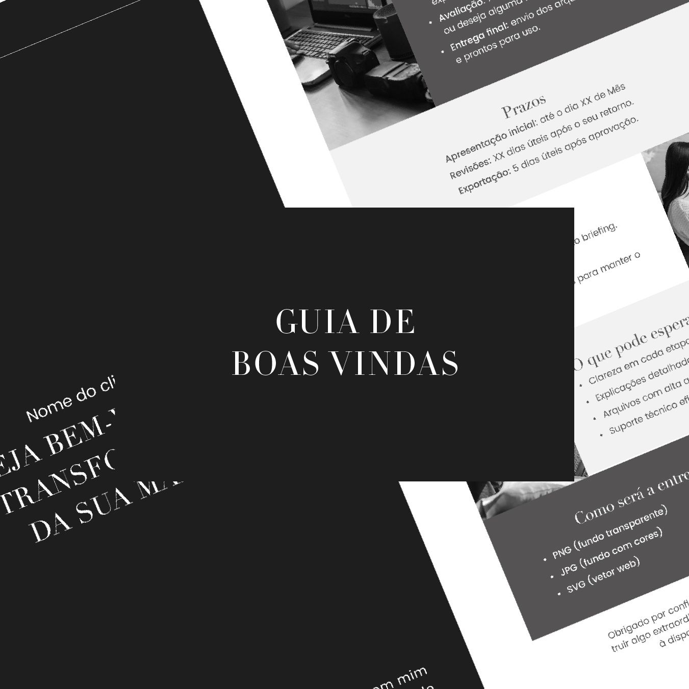 Guia rápido enviado após a contratação que organiza o processo do projeto e prepara o cliente para o início da identidade visual.